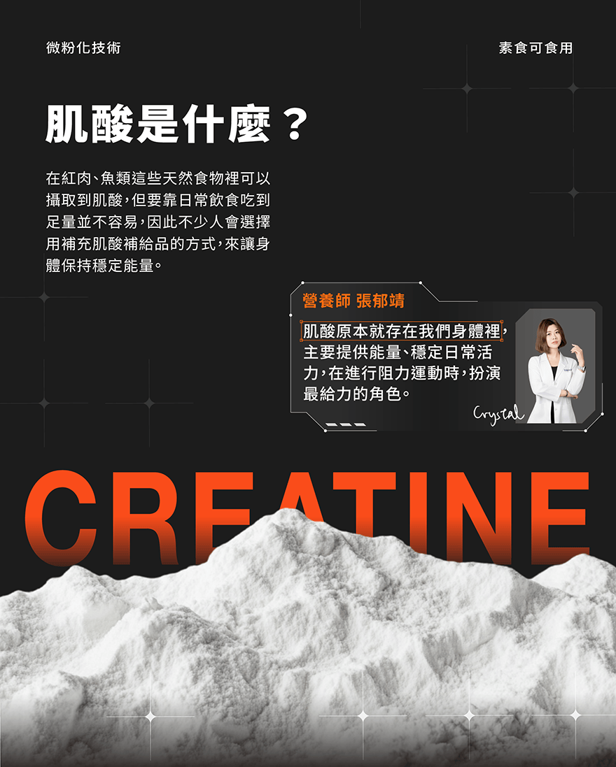 Creatine 肌酸是由精胺酸、甘胺酸和甲硫胺酸等三種胺基酸組合而成的天然化合物。