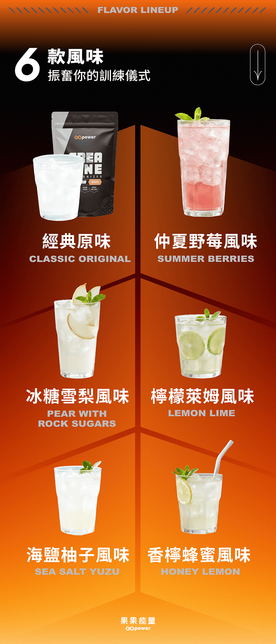 除了經典原味可以自行調飲外,獨家推出調味款肌酸,每次補充都像在喝飲料,豐富你的訓練日常。